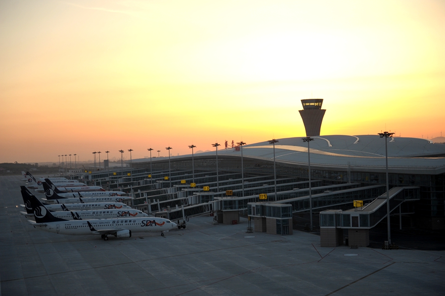 夕陽下的煙臺(tái)蓬萊國際機(jī)。