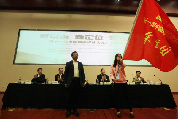 中共山東省委宣傳部副部長、山東省互聯(lián)網(wǎng)信息辦公室主任李建軍為采訪團(tuán)授旗,采訪團(tuán)成員代表孫唯千接旗,“新常態(tài)·新定位·新提升——第十一屆中國網(wǎng)絡(luò)媒體山東行”大型采訪活動(dòng)正式啟動(dòng)。
