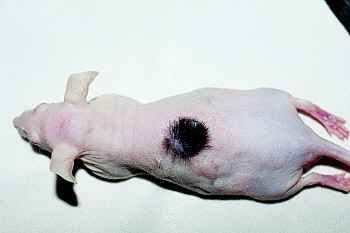 大部分小老鼠鼠皮上沒有毛發,皮膚呈裸色。小老鼠背上有一塊一寸見方的皮膚顏色略深,上面長著黑色毛發。