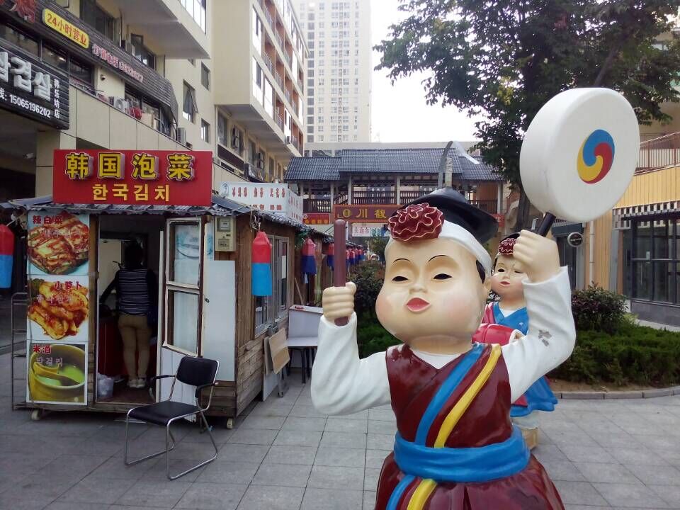 除了韓國風格的建筑雕塑,韓樂坊內自然也少不了各種韓國文化風情。這里有韓國民俗泡菜體驗館、韓國婚慶體驗館、韓國傳統服飾體驗館,是威海最具“韓范兒”的地方。以韓國風情為主題的美食一條街,則聚集了40余家韓國料理餐飲企業入駐。泡菜、烤肉、拌飯……在這里,你能品嘗最地道的韓國美食,盡情享受舌尖上的韓國,就連店鋪的名字和菜單都是用中韓雙語書寫的,每一處細節無不透著韓國元素。