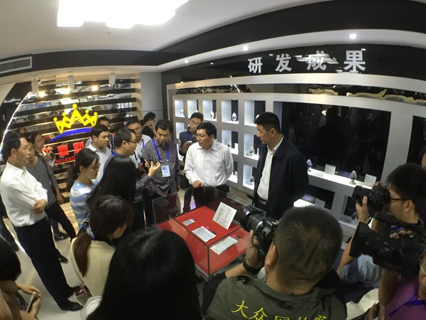 玉皇新能源科技有限公司工作人員向采訪團(tuán)介紹高效能電池的核心部件電芯