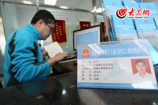 邱飛是濟南市建委清欠辦派駐濟南市農民工綜合服務中心的工作人員,2014年7月底起,他在中心的勞動維權窗口值班,負責幫助建筑領域農民工追討欠薪。有農民工來反應欠薪問題時,邱飛要先對情況進行核實,一旦核實無誤,他就立刻電話聯系欠薪單位,協調項目總包、分包負責人到中心現場解決,邱飛說,理論上市區內的工程負責人40分鐘內就要到場,如果問題無法現場解決,他還要在3天之后進行追訪,一人負責到底。