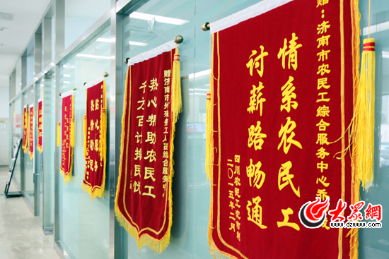 濟南市農民工綜合服務中心墻上掛的錦旗。(大眾網記者 孫乘昀 攝)