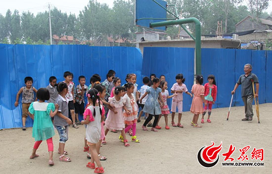 馮佃生拄著拐杖和孩子們玩游戲