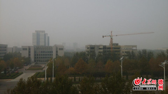 德州實(shí)時(shí)空氣質(zhì)量重度污染,霧霾天,遠(yuǎn)處的建筑物影影綽綽