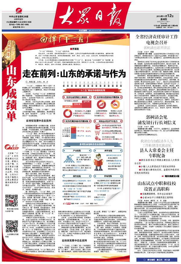 今天起,大眾日?qǐng)?bào)領(lǐng)銜推出大型融媒體報(bào)道《回眸“十二五”》,重點(diǎn)打造“山東成績(jī)單”和“我滿意 我講述·100個(gè)人的山東故事”兩個(gè)欄目。報(bào)道回顧梳理過去五年來,特別是十八大以來,山東經(jīng)濟(jì)社會(huì)發(fā)展的新作為、新亮點(diǎn)、新變化,展示工作亮點(diǎn),展現(xiàn)群眾感受。