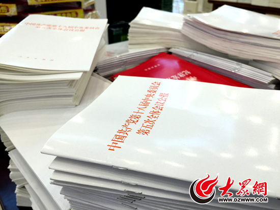 11月7日,山東濟南一家新華書店中,《中國共產黨第十八屆中央委員會第五次全體會議公報》被擺放在顯著位置,吸引眾多讀者。記者 馬俊驥 攝