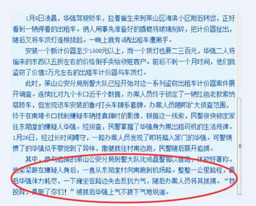 2014年1月,沈成磊抓捕盜竊出租車(chē)計(jì)價(jià)器、頂燈案時(shí),追出一公里,累癱了盜賊。媒體報(bào)道截圖