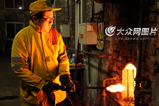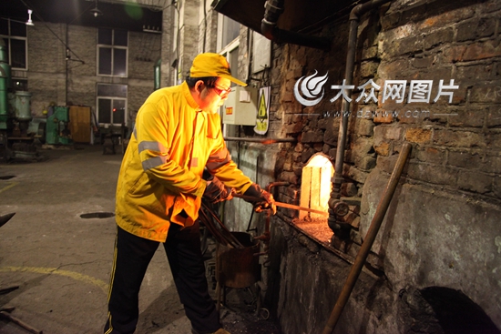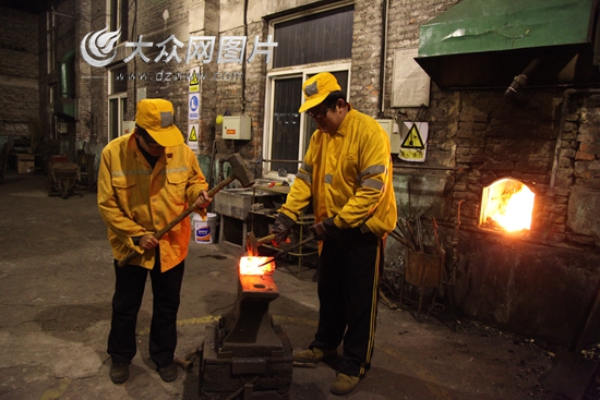 大眾網(wǎng)記者真切的感受到“鐵匠”這份活真是不好干:靠近烘爐邊,熱浪迎面襲來(lái),烘爐旁師傅的臉被爐火烤的通紅。烘爐旁空氣錘下火星四濺,旁邊“小心燙傷”的提示顯得格外醒目。
