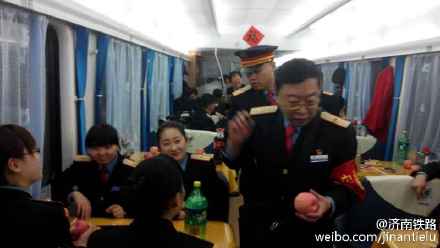 @大眾網:2月18日20:05,李建國老師到達餐車,與備勤的乘務員們一起聚餐迎新春。今年即將退休的他最后一次為年輕乘務員們派發蘋果,祝愿她們年年歲歲,平平安安!