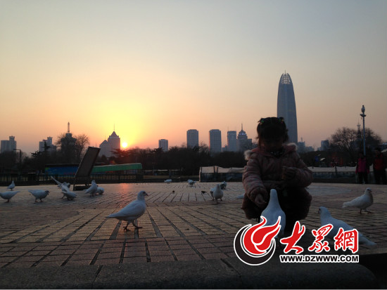 除夕傍晚,一個(gè)小女孩正在泉城廣場喂食和平鴿(大眾網(wǎng)記者韋輝 攝)