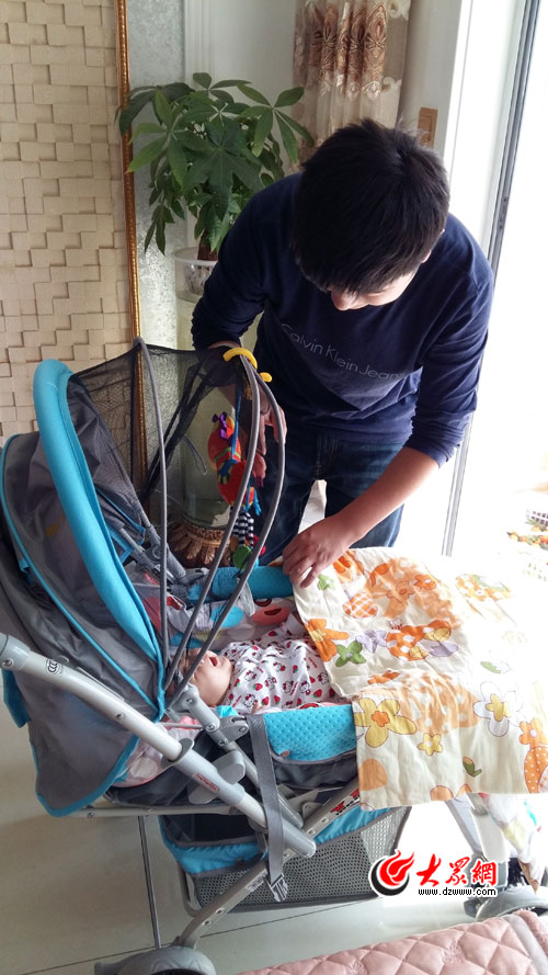 蒙子輕輕的搖晃嬰兒車,父愛滿溢
