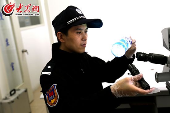 孫振正在對一只礦泉水瓶做指紋檢測(資料圖)