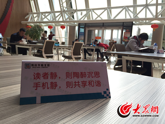 在濰坊市新圖書館的門前貼著一張簡單的告示,上面寫著春節期間的開館時間,每天早上九點開館,比平常晚了半個小時,下午五點閉館,比平常提前了半個小時,每天的開放時間只比平時少了一個小時,變化不大。
