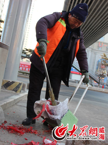 孫尚貴是環翠區環衛局的一名環衛工,也是清晨打掃城市衛生的眾多環衛工中的一員。早上7點左右,漸漸開始起風了,4到5級的北風吹在身上并不會讓人感到非常寒冷,但北風呼嘯過處,路面上積存的鞭炮碎屑就會隨風打著旋兒,一會兒飄在空中,一會兒鉆到角落里。經過了3個小時的清掃,他仍對路面上的鞭炮碎屑感到十分頭疼!懊磕瓿跻欢际沁@樣,早上一上崗就得抓緊清掃路面上的鞭炮碎屑,今天有點小風,清掃時手要快!”說著,老孫眼明手快地在起風之前將地上的碎屑收到鐵簸箕里,并用掃帚將碎屑向內塞了塞。