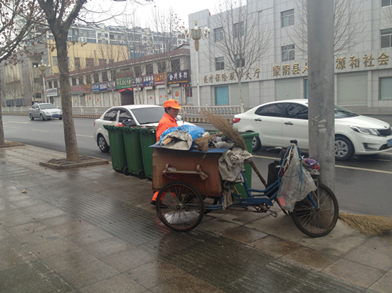 記者與王主任沿路步行向東,聊及蒙陰縣的環(huán)衛(wèi)工作。“年年都是這樣,越過年越得干。”春節(jié)期間是垃圾清掃處理的高峰時節(jié),每天的工作量是都要比先前翻倍,有的路段甚至是幾倍。春節(jié)期間每輛垃圾處理車的司機都要跑上9~10趟,無論是清掃人員還是清運人員,工作量都已經(jīng)是超負荷了。“大過年的誰不想在家,可工人們都沒法過年,我這心里也不踏實。為了讓縣城環(huán)境更好,今年我們實行了全員輪崗制,環(huán)衛(wèi)工人春節(jié)長假一天都沒有完整地休過。他們在,我也得在。年是一樣的,大家都得過。這不我說了,中午我們休息一個小時,一起吃個飯過大年!”王主任說到這又樂呵了,我知道,在他眼里,這些路面上的勞動者都是他的戰(zhàn)友,也是他們環(huán)衛(wèi)大家庭中不可或缺的成員。