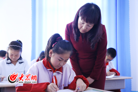 李淑芳在平度一小學送課時,在課堂上對小學生進行指導。(亓翔 攝)