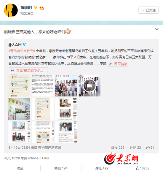 6日10:28,黃曉明在微博上轉(zhuǎn)發(fā)了@大眾網(wǎng)對(duì)“支教島”報(bào)道的微博,他在轉(zhuǎn)發(fā)時(shí)評(píng)論說:“燃燒自己照亮他人,家鄉(xiāng)的好老師們”,并豎起大拇指為“支教島”點(diǎn)贊。大眾網(wǎng)記者看到,黃曉明轉(zhuǎn)發(fā)微博一個(gè)小時(shí)之內(nèi),該微博的閱讀數(shù)已突破100萬,網(wǎng)友點(diǎn)贊超過1萬次。網(wǎng)友@望雀山莊說:“點(diǎn)贊并提前祝老師們教師節(jié)快樂。”@佟心穎star_沐溢說:“我的青島棒棒的,等我有時(shí)間了也去做義工。”網(wǎng)友@想突變到172cm的肖亞瓊說:“真為自己是青島人感到自豪。”