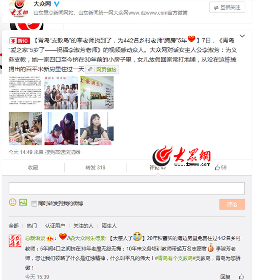 大眾網濟南8月11日訊(記者 盛堃)“平凡的偉大,感動中!”“為李淑芳老師點贊!”11日下午,大眾網報道“青島支教島的李淑芳,為442名鄉村老師騰房5年”一事后,受到眾多網友關注。在短短半天的時間里,網友紛紛在山東24小時客戶端、微博、微信等平臺為李淑芳和“支教島”點贊,文章轉發、評論已達數萬次。今天,“支教島”刷爆了網友的朋友圈,“微傳播”的凡人善舉感動了萬千網友。