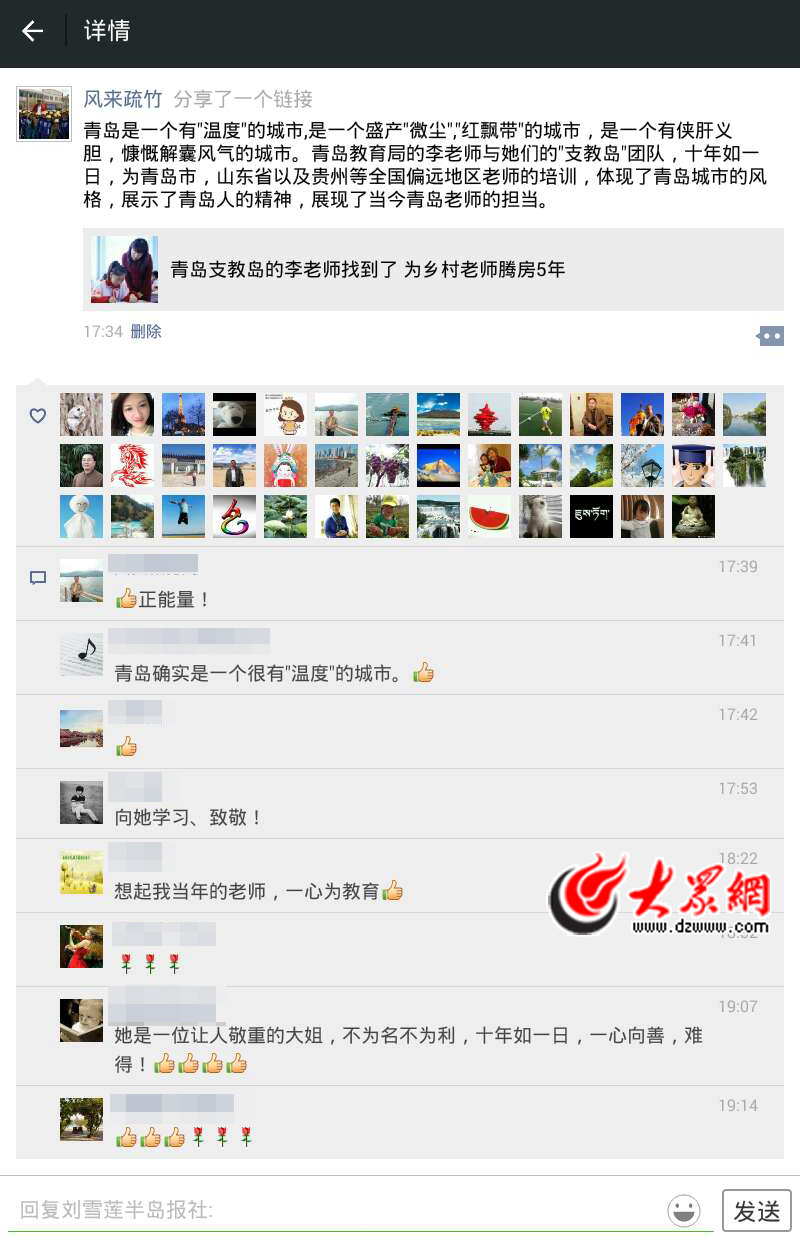 “風來疏竹”的說法受到朋友們的一致認可,大家點贊不斷。大眾網官方微信發表的《是這么一名山東女子,讓貴州的185位鄉村教師如此感動和想念》也被網友紛紛轉發,朋友圈里被“支教島”和李淑芳刷屏。