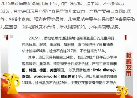 2015年,質檢總局對通過跨境電商渠道進口的兒童用品,包括玩具、服裝、紙尿褲、餐廚具、濕巾等進行了質量抽查,總計抽樣654批,檢出不合格217批,不合格率為33%。