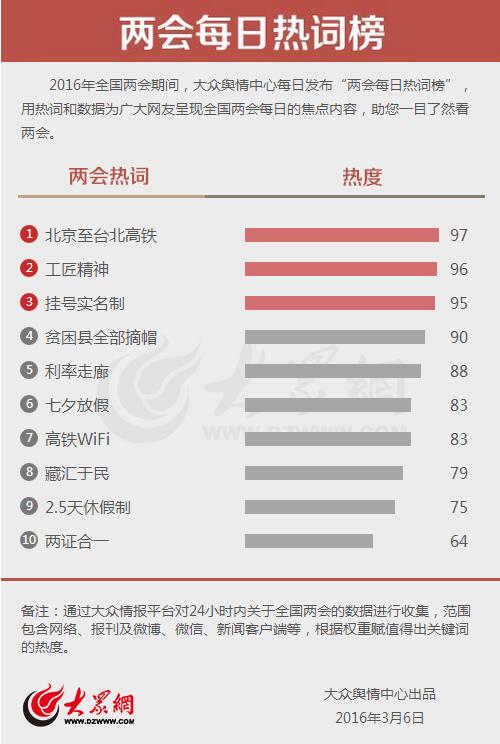 大眾網(wǎng)濟(jì)南3月6日訊(記者 劉欣 劉洪 王曉光)今天,大眾輿情中心發(fā)布第五期“兩會(huì)每日熱詞榜”。隨著兩會(huì)正式日程進(jìn)入第四天,今日上榜的熱詞涉及高鐵、脫貧、外匯儲(chǔ)備等多個(gè)話題。其中,“北京至臺(tái)北高鐵”“工匠精神”“掛號(hào)實(shí)名制”分別以97、96和95的熱度名列榜單三甲。