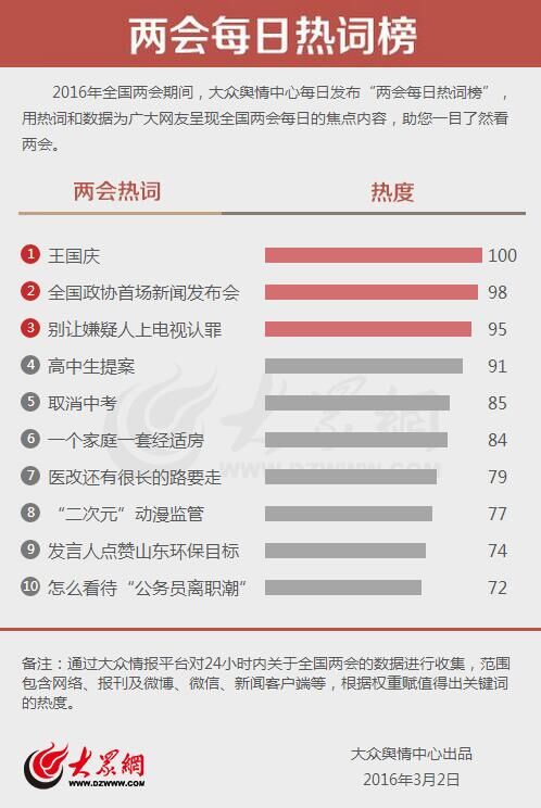 大眾網(wǎng)3月2日訊 (記者 劉欣 王曉光 宋瑋瑋)今天,大眾輿情中心發(fā)布第一期“兩會(huì)每日熱詞榜”。“王國(guó)慶”“全國(guó)政協(xié)首場(chǎng)新聞發(fā)布會(huì)”“別讓嫌疑人上電視認(rèn)罪”分別以100、98和95的熱度進(jìn)入熱詞榜前三名。
