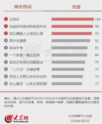 今天,大眾輿情中心發(fā)布第一期“兩會每日熱詞榜”。“王國慶”“全國政協(xié)首場新聞發(fā)布會”“別讓嫌疑人上電視認罪”分別以100、98和95的熱度進入熱詞榜前三名。