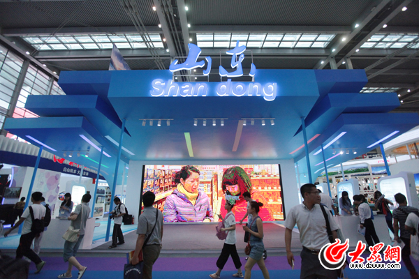 山東展區展覽面積為525平米,是山東參展歷屆深圳文博會以來的最大面積,也是文化產業綜合館中政府組團參展的最大面積。展區整體色調為藍色漸變黃色,契合“藍黃兩區”戰略,展廳采用奔涌而來的“海浪”造型,寓意山東文化走向世界。魯版圖書、精品魯劇、孔子文化產品、山東各地的特色文化產品在展區集中亮相,展現著山東多樣且深厚的文化底蘊,給文博會增添了濃濃的“山東味兒”,吸引了眾多觀眾前來觀展。
