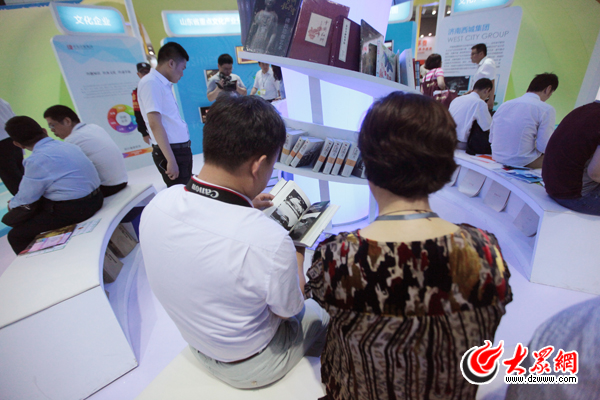 魯版圖書、精品魯劇、孔子文化產品、山東各地特色文化產品等吸引了眾多觀眾。圖為兩位觀眾坐在展區休息處認真閱讀魯版圖書。記者 馬俊驥 攝