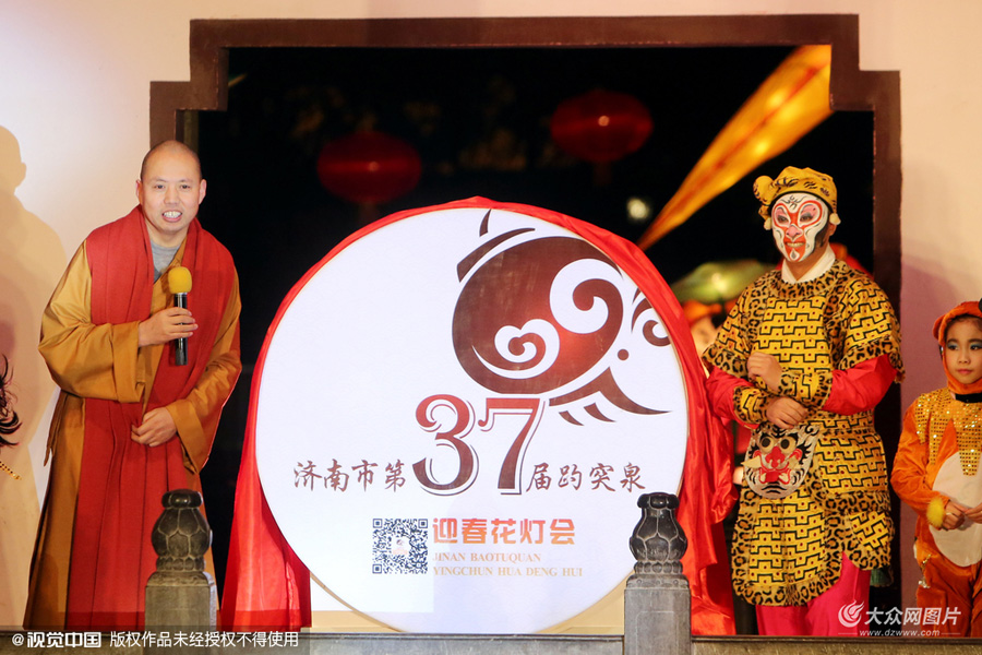 2016年2月2日,濟南,有著“最萌法師”稱號的延參法師與“美猴王”一起亮相趵突泉畔,一起為濟南市第37屆迎春花燈會舉行開燈儀式。圖片作者:溫流/視覺中國