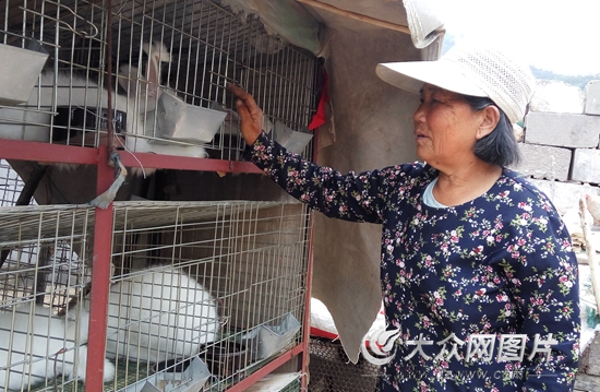 蒙陰縣舊寨鄉殷家嶺村的大山深處,71歲的徐美鳳老人看著飼養的36只長毛兔,每年能為她增收2500元左右。(記者 王宗陽 攝)