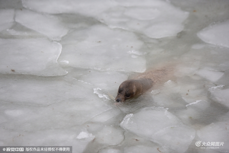 2016年01月20日,山東省煙臺(tái)市,在山東煙臺(tái)東炮臺(tái)海濱風(fēng)景區(qū)生態(tài)海豹灣,斑海豹在冰水中游動(dòng)。