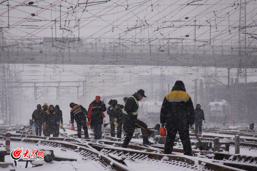 濟南鐵路局濟南工務(wù)段搶險小分隊在濟南站冒雪巡查線路設(shè)備。