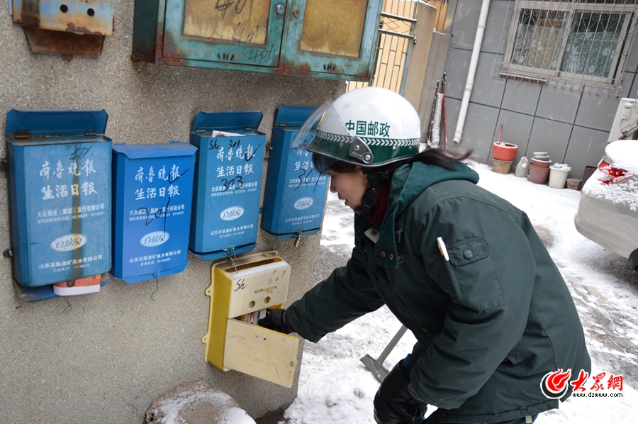 趙大姐第一個投遞點是濟南市房管局。我們從經二路的濟南市郵政局向東騎,沿著緯二路南行,雪花一個勁地與我的脖子和耳朵“親密接觸”。騎了不到1公里,我耳朵便從最初的“發(fā)麻”,變成“火燒一樣的疼”……我趕緊從附近商店買了倆耳套,自己帶上一個,另一個遞給了趙大姐。她看著我窘迫的樣子,有些無奈地笑了:“我習慣了,帶上反而不得勁。”