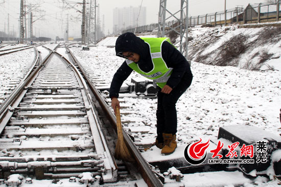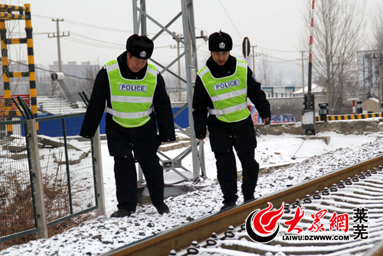 大眾網萊蕪1月23日訊(記者 亓秀寶)22日,萊蕪市寒潮“冬道主”迅猛到來,自早8點半左右開始自北向南給萊蕪披上了一層“棉被”,寒潮的到來對萊蕪各行各業都產生了很大的影響,鐵路部門對降雪更是不敢小覷,鐵路公安的民警也加入到了清雪的行列中,清岔口、巡線、指揮道口交通,坐不住的他們全天候行走在鐵路一線。