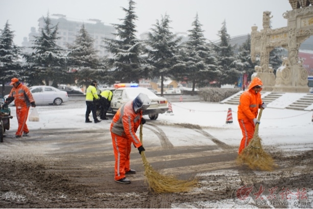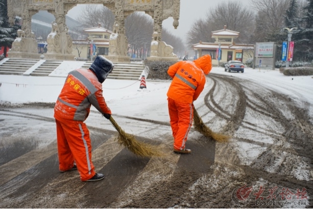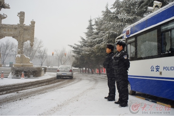 攝于今天中午12點,濟南舜耕國際會展中心出入口處,公安干警在雪中值勤,環衛工人及時清理干凈道路確保安全出行。