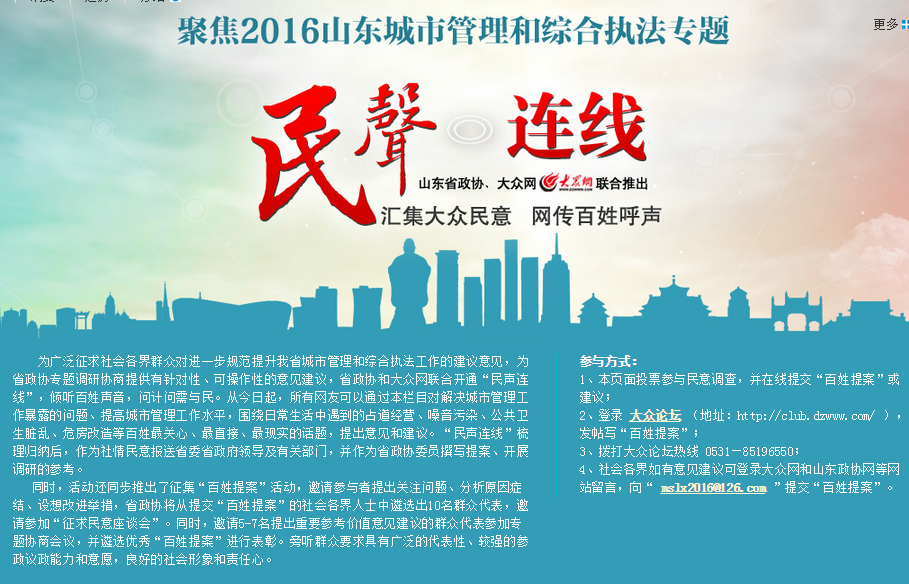 本次省政協“民聲連線”活動的征集時間為3月10日至5月20日,除在大眾網等媒體網絡平臺推出大型民意調查外,還推出征集“百姓提案”活動,歡迎廣大群眾圍繞城市管理和綜合執法提出關注問題、分析原因癥結、設想改進舉措。您身邊有亂倒生活和工業垃圾、違章占道擺攤的現象嗎?您關心危舊房屋的整改拆除、外來人口的醫療教育及管理問題嗎?您目前所在城市的管理效果如何,存在哪些突出問題?您對于城市管理執法隊伍的評價如何,有啥好點子好想法嗎?歡迎登陸大眾網相關專題(http://www.gaoxiaozai.com/2016/jj2016/)、省政協網站、聯合網等網絡平臺投票留言,在線提交“百姓提案”。您還可以關注“山東政協”微信公眾號后在“民聲連線”欄目提交建議,或發送郵件至minshenglianxian@163.com,提出您對規范城市管理和綜合執法工作的建議、期待。