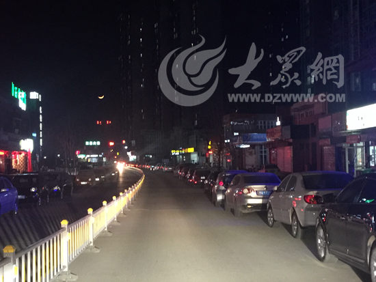 我們在晚上的時間,在路邊很多小區周邊的馬路上,拍了一些停車的圖片。這是在領秀城里邊,這一張是在濼源大街,有兩輛車是違法停車,一個停在輔道上,一個停在人行道上。這個是大概11月左右,在家樂福過街天橋上拍,雙向BRT車道上看不到一輛車,但兩側的行車道上行駛非常緩慢。