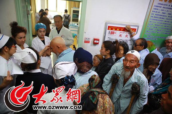 “喀什光明行”活動經過前期幾個月的籌備工作,8月30日如期走進第一站麥蓋提縣人民醫院。當天,天空中下著小雨,氣溫有些低,當以山東大學第二醫院眼科主任張晗為核心的專家團隊來到眼科門診的時候,走廊里站滿了人,門外的白內障患者和家屬們滿臉焦急,早已排隊等候著專家做術前檢查和手術。專家團隊稍做準備后,立即進入工作狀態。人群一側,一位身穿病號服的老奶奶引起了記者的注意,老人貼墻而站,沒有任何人陪伴,和人群保持了一定距離,和旁邊被左右家屬攙扶的白內障老人們比起來顯得尤為孤獨。記者好奇的走了過去,因為語言不通,所以需要憑借醫院護士的翻譯,在簡單的了解后,老人的遭遇令記者深感同情。圖為白內障患者等待著山大二院專家做術前檢查。王厚江 攝影