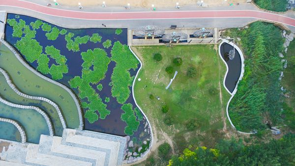 蜿蜒綿長(zhǎng)的健身步道,四周郁郁蔥蔥,往東看是一片綠林,北邊睡蓮開的正盛,西邊太陽(yáng)谷微排大廈氣勢(shì)恢宏,南邊幾艘游船泛舟河中(撒偉 攝)