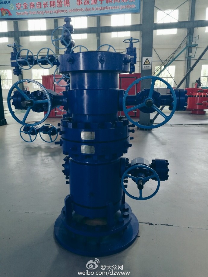 隨后,采訪團(tuán)來到科瑞集團(tuán)車間。據(jù)介紹,車間里有些設(shè)備是用來裝載我們所熟悉的“磕頭機(jī)”。為了保證鉆井抽油的質(zhì)量,科瑞采用了具有獨(dú)特的防噴防壓技術(shù)。其中一件藍(lán)色設(shè)備為Y型整體式采油樹,相當(dāng)于一棵大樹的“樹根”,它采用整體式安全閥,可以減少石油潛在泄露點(diǎn)。