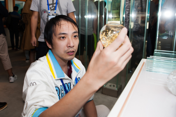 采訪團記者被金晶集團制作的精美玻璃工藝品吸引。(撒偉 攝)