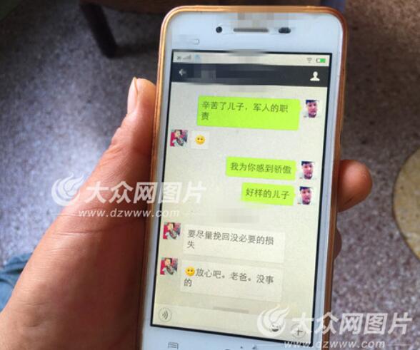 通過微信朋友圈,焦連勇看到了焦磊受傷的腳。焦連勇說,雖然心疼,但是更多的是為兒子感到驕傲和自豪。看到微信朋友圈轉(zhuǎn)發(fā),牽掛兒子傷勢的焦連勇,隨即給焦磊留言,詢問焦磊受傷情況。“沒事,問題不大,很快就好了”,焦磊寬慰父親。“兒子,我為你驕傲”,平時經(jīng)常批評兒子的焦連勇沒忍住說了這句話。焦連勇說,抗洪救災(zāi)是軍人職責(zé),焦磊和部隊?wèi)?zhàn)友一起抗洪救災(zāi),作為家長感覺很光榮。葛祥芝告訴大眾網(wǎng)記者,兒子當(dāng)兵五年,每次回家,丈夫都會默默準(zhǔn)備很多飯菜,不大會表達(dá)自己的感情,平時對孩子一直很嚴(yán)厲,還是第一次看見丈夫?qū)⒆诱f這種話。