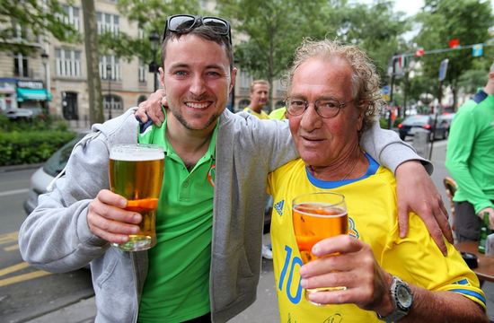 球場上,愛爾蘭0:3不敵比利時,可是愛爾蘭球迷完全不介意,在賽后竟然與比利時球迷一起慶祝。