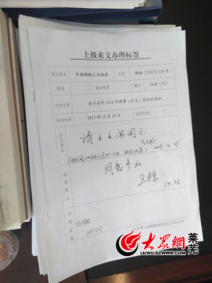 王守東批閱的關于參加中國鋼鐵協會會議的文件(記者 亓秀寶 攝)