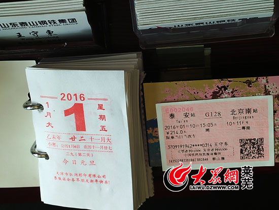 王守東辦公桌上準(zhǔn)備去北京參加會(huì)議的車(chē)票,而王守東的生命定格在了2016年1月1日(記者亓秀寶攝)