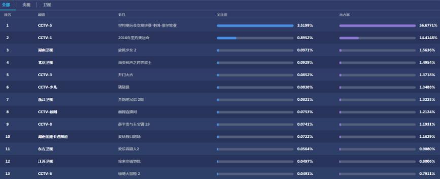 北京時(shí)間8月21日09:15,里約奧運(yùn)女排決賽打響,中國(guó)女排對(duì)陣塞爾維亞,這場(chǎng)比賽吸引了全中國(guó)電視觀眾的目光,收視率達(dá)到了夸張的56.78%,同一時(shí)期,湖南衛(wèi)視、北京衛(wèi)視等熱門(mén)電視臺(tái)的收視率僅女排的1/50。