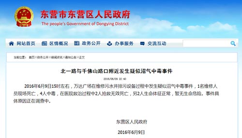 山東24小時(shí)10日訊 據(jù)東營(yíng)市東營(yíng)區(qū)人民政府官網(wǎng)消息,6月9日15時(shí)左右,東營(yíng)區(qū)萬(wàn)達(dá)廣場(chǎng)在維修污水井排污設(shè)備過(guò)程中發(fā)生疑似沼氣中毒事件,1名維修人員現(xiàn)場(chǎng)死亡,4人中毒,在醫(yī)院救治過(guò)程中2人搶救無(wú)效死亡,另2人生命體征正常,暫無(wú)生命危險(xiǎn)。事件具體原因正在調(diào)查中。