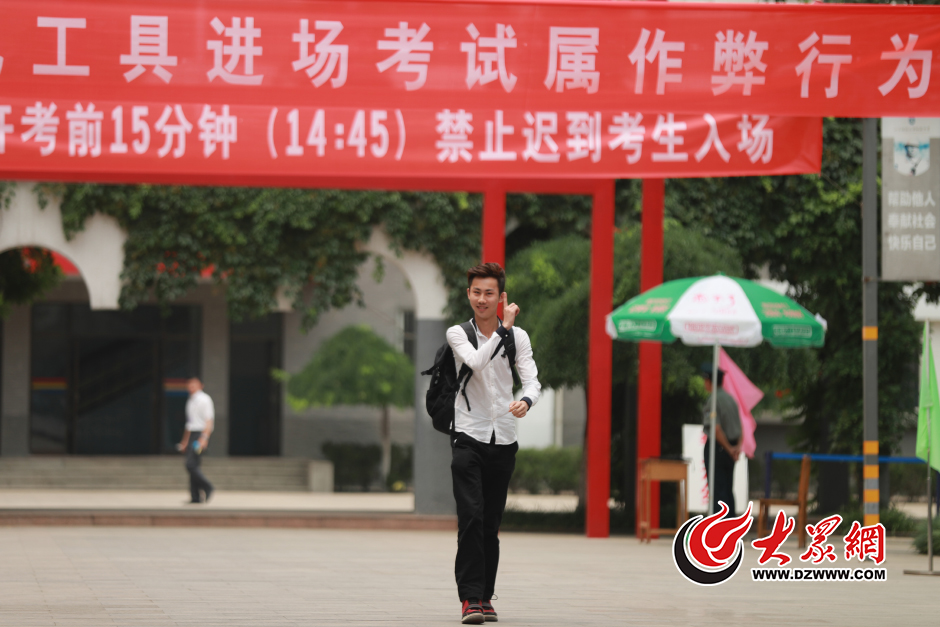 6月7日上午11點30分,隨著鐘聲的敲響,高考首日上午語文科目考試結(jié)束,在山師附中考點,一考生輕松走出考場,面對鏡頭擺出勝利的手勢。大眾網(wǎng)記者 王長坤 攝